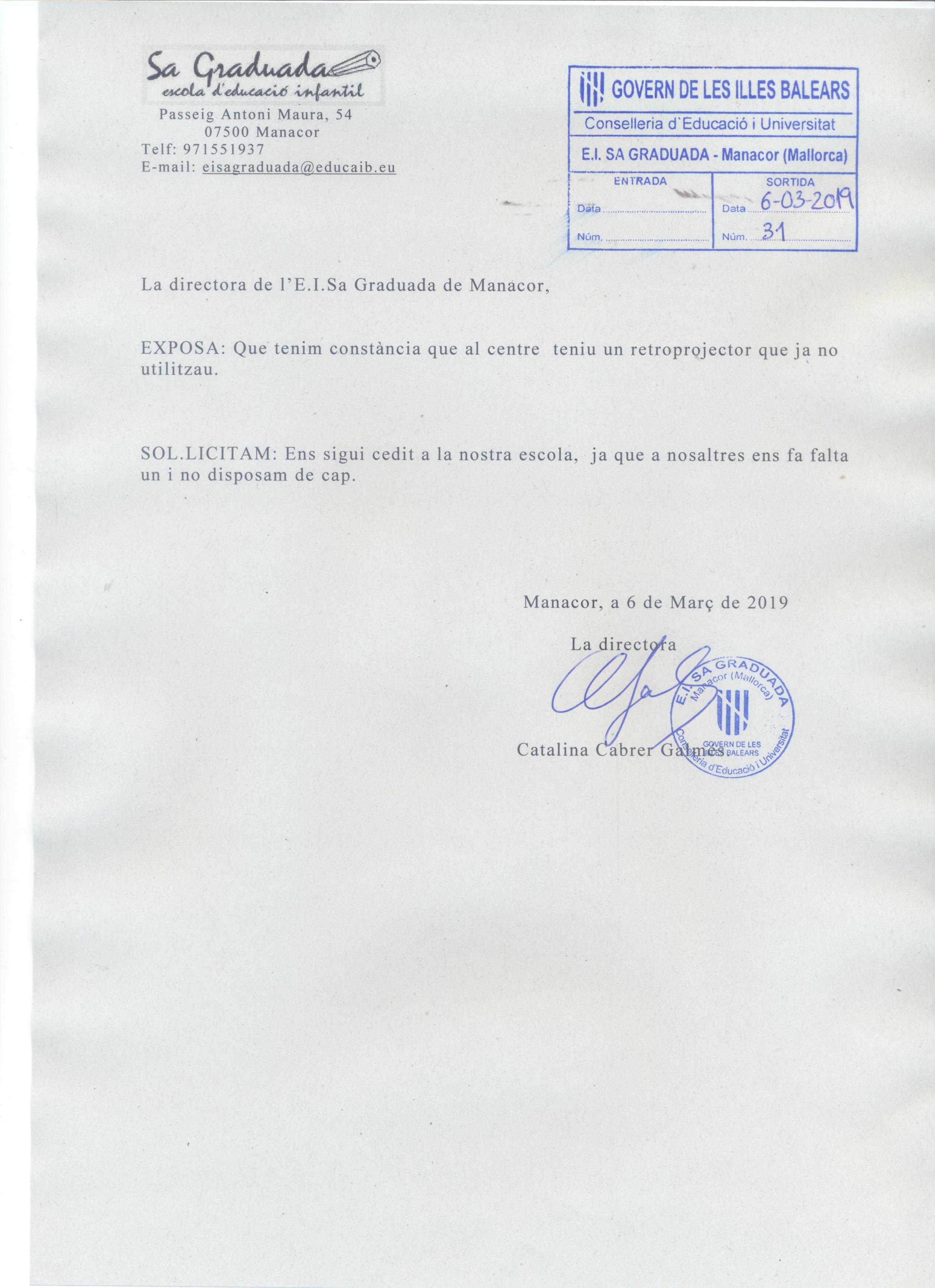 A partir de la seva sol·licitud i una vegada haver comprovat que en tenim dos i que un no li farem ús, es va decidir cedir temporalment a l'escola que ho sol·licitava amb el fi de donar-li un ús en un dels seus projectes.