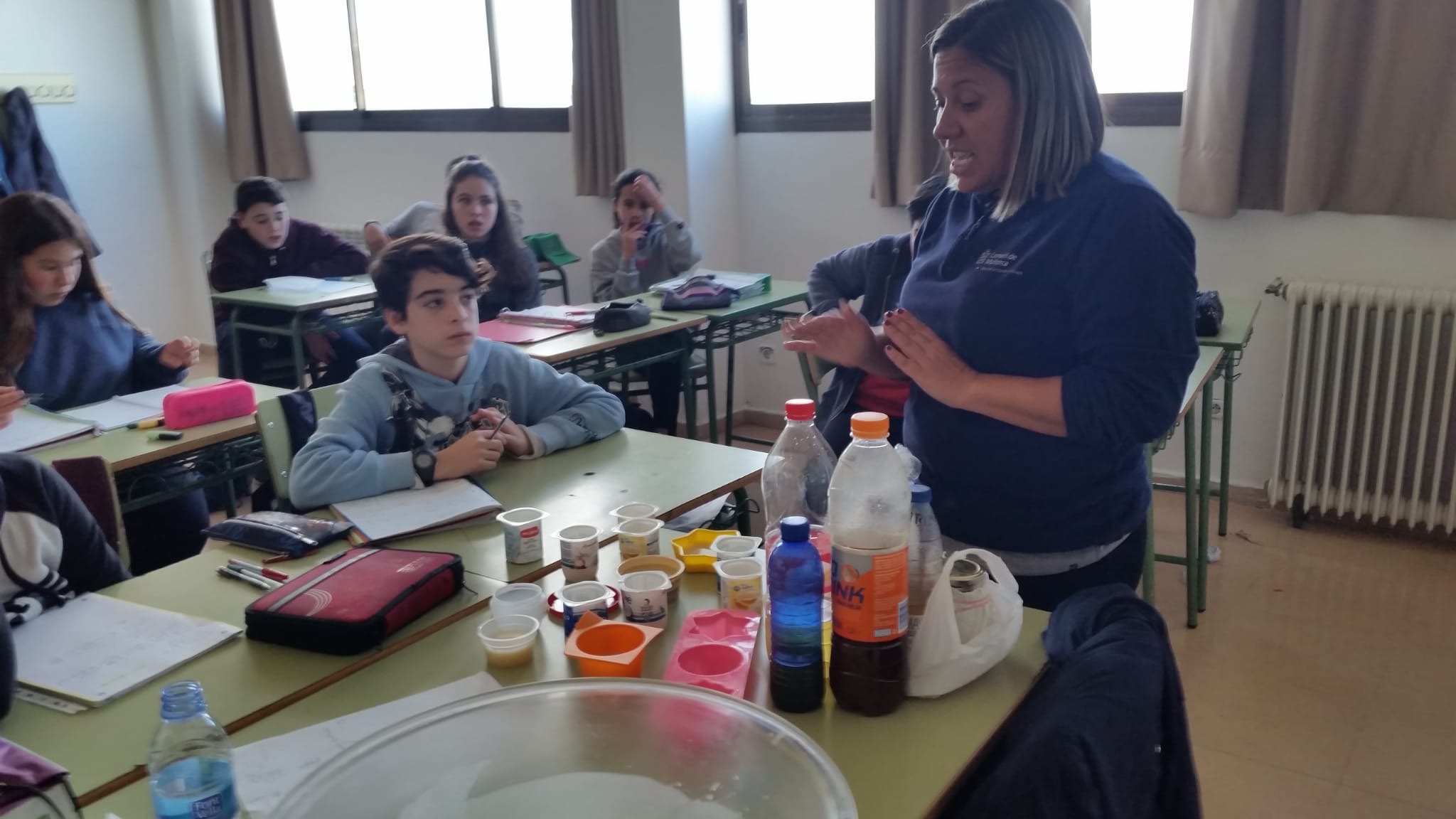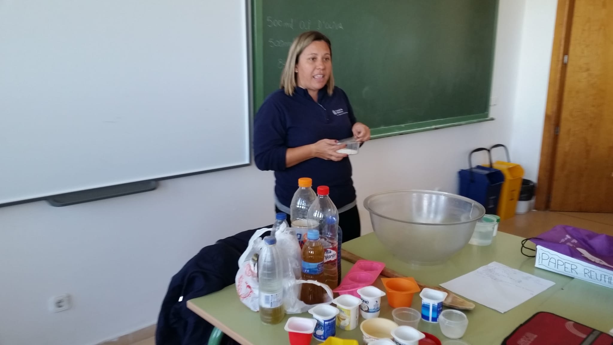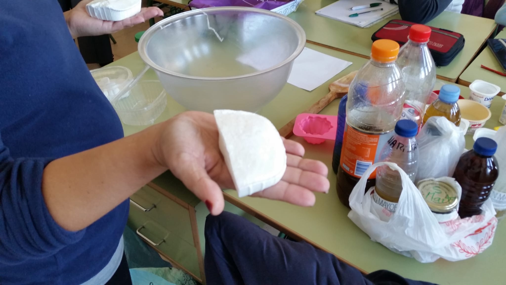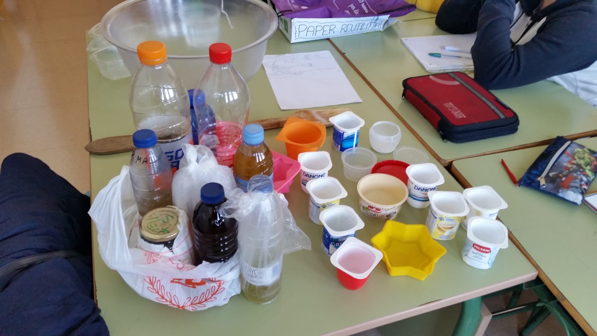 Els alumnes de 1r ESO han realitzat un taller per reciclar oli usat i fer sabó. La tècnica usada ha estat mesclar l'oli que han portat els propis alumnes amb sosa. S'ha produït una reacció química anomenada de SAPONIFICACIÓ. Cada un dels alumnes ha realitzat la seva pastilla de sabó que podrà usar a casa seva.