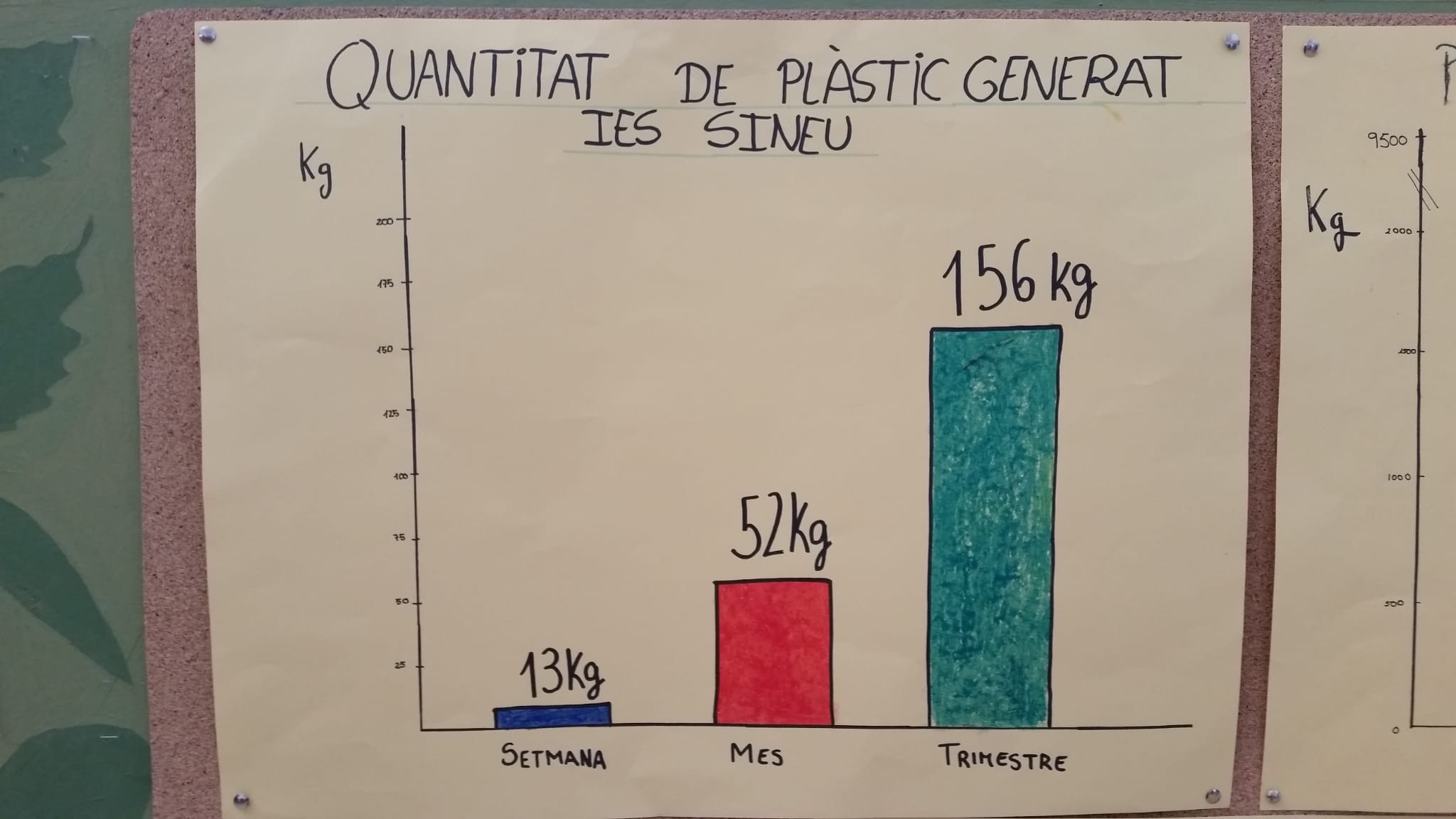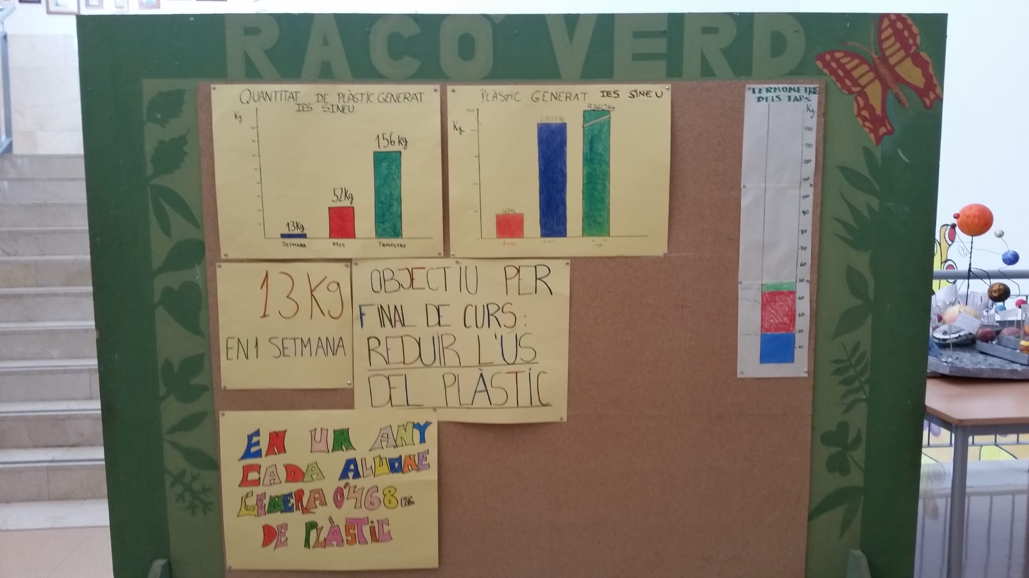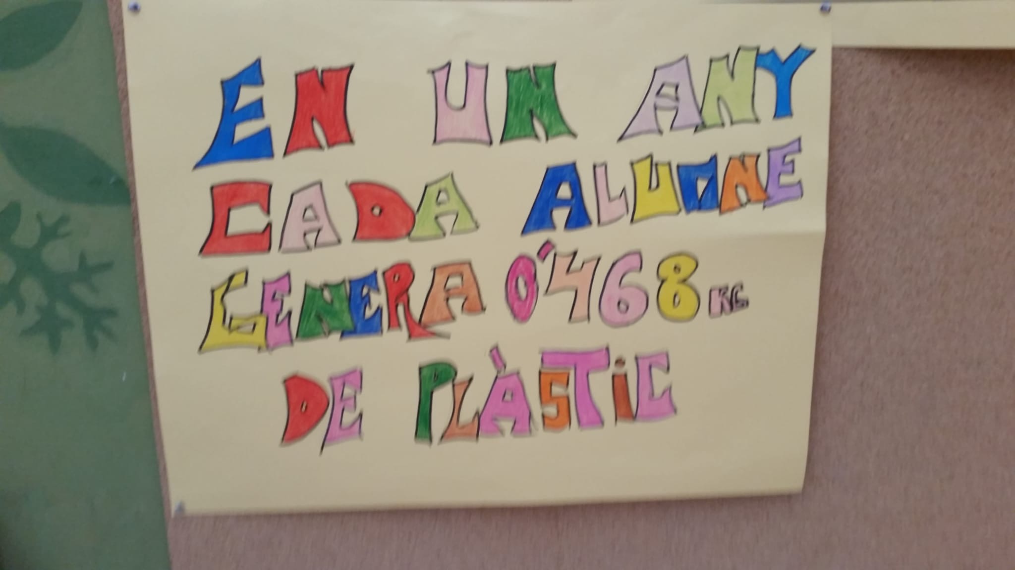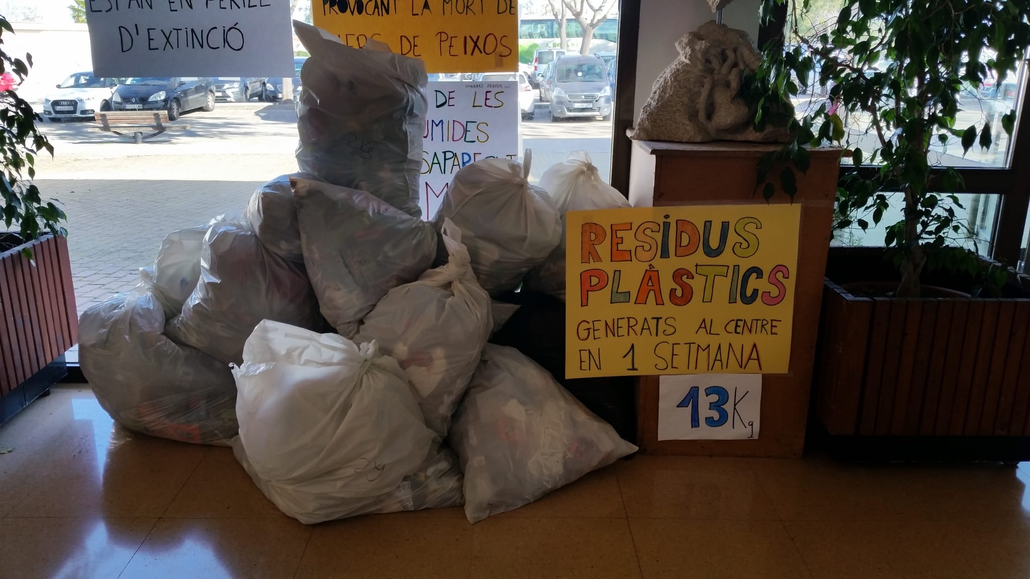 S'ha realitzat una activitat en la que s'ha pesat la quantitat de plàstic generat en 1 setmana al centre i ha sortit que fem entre alumnes i professors: 13 Kg. Fent extrapolacions, això suposaria 52 Kg en 1 mes. En 1 trimestre serien 156 kG. En 1 curs això suposarien 468 Kg!!!!! De cara a final de curs he d'aconseguir reduir la quantitat de plàstic que generam.