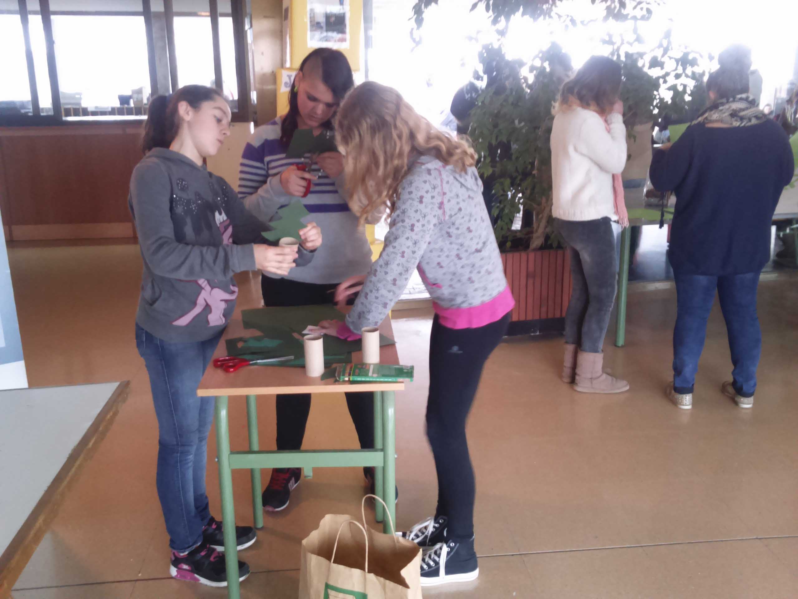El mateix 16 de febrer la Comissió Ambiental va organitzar un taller de manualitats amb material reciclat durant el temps d'esplai . Els alumnes que hi van participar amb realitzat arbres amb diferents materials que han estat exposats a l'entrada del Centre. Amb aquesta activitat es pretén conscienciar de la necessitat de reutilitzar i reciclar per intentar reduir la quantitat de rebuig i sobre tot de la necessitat de preservar els nostres boscos.