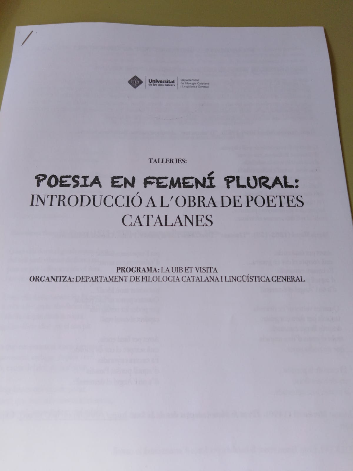 L'alumnat de 1r. Batxillerat ha participat en el Taller Poesia en femení plural organitzat pel Departament de Filologia Catalana i Lingüística General dins del programa la UIB et visita i impartit per la professora Mercè Picornell.